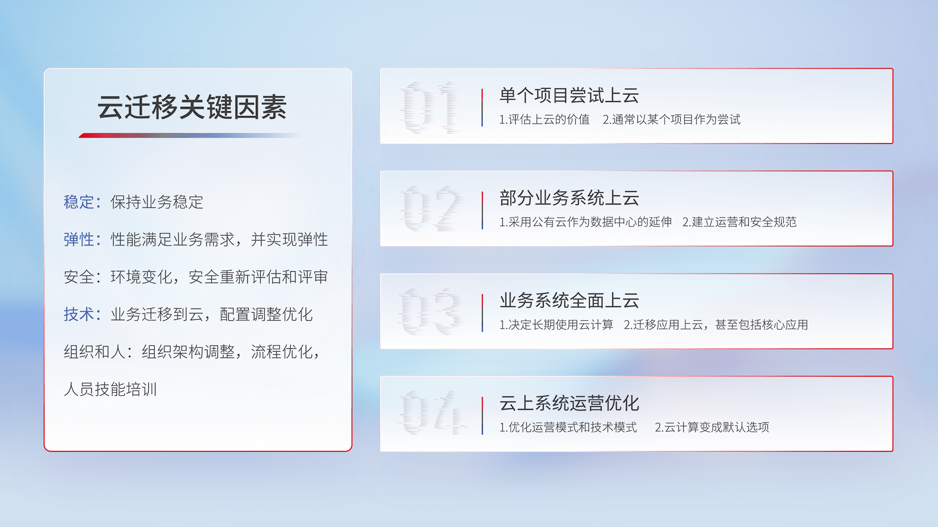 结合实际业务,,,,从规划设计、、、云平台选型、、、、云原生改造、、数据迁移、、、、集成交付,,迁移全过程为客户识别最佳上云路径,,做好风险识别管理,,,设计网络架构、、、、身份权限、、、安全审计合规、、操作审计、、、日志审计、、、监控告警策略、、、、多站点容灾设计等,,,,对云上基础设施进行整体规划,,,,提升IT治理水平,,,以满足弹性、、高可用、、、、高性能的需求。。。。
