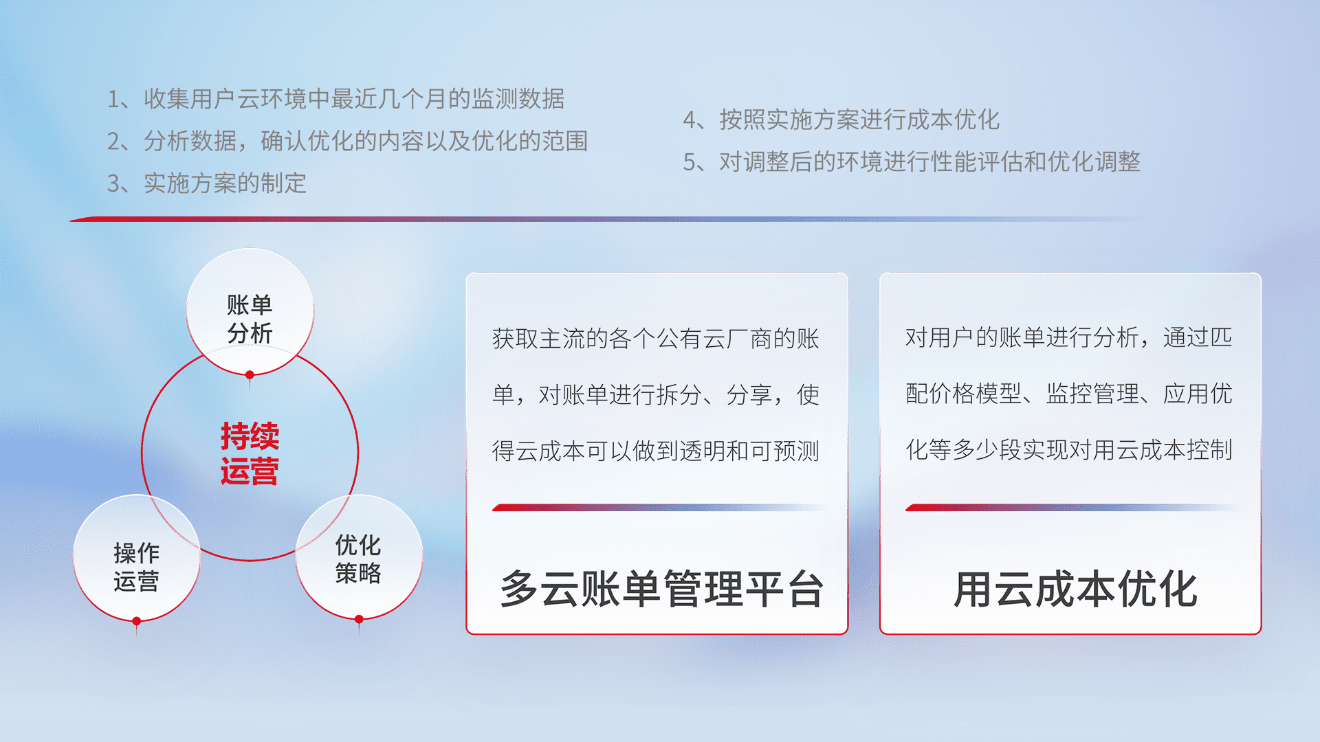 通过多云纳管,,,,以统一的资源数据模型把客户的云资源进行抽象和封装,,,进而实现对多云资源的统一操作,,保障云资源管理的可靠性、、、稳定性与可用性。。。。量身定制化运维内容,,,配置、、开发运维、、补丁管理、、备份、、监控、、、、认证和访问管理、、、、审计和日常巡检等,,,保障在用云过程中的可靠度,,,稳定度以及高可用率。。