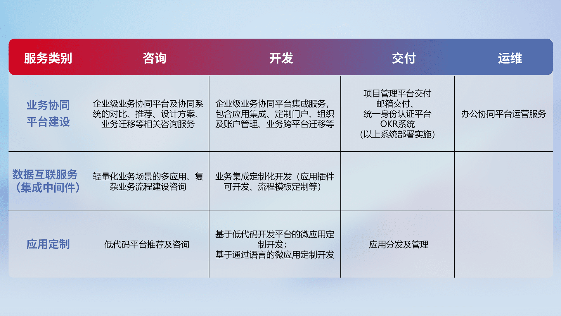 针对钉钉、、企微、、IDaas等平台级产品提供产品的规划、、方案、、、交付、、、定制化开发等服务,,,,实现如统一协同办公、、、、智能客户服务、、、混合会议管理、、、智能数据查询、、等业务场景,,,,实现数字化转型。。